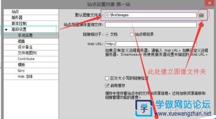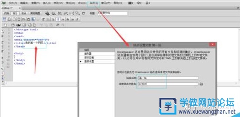4、网站是有站点的,下面新建一个站点,单击站点-》新建站点,弹出如下对话框,将网站名称起名为“第一站”,站点文件夹点击后面的文件夹小图标新建一个即可,文件夹只能用英文字母。