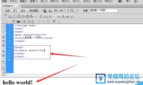 6、都设置妥当后在页面的代码区域输入如下代码,在底部可以看到预览效果。如果不会写代码的话,可以学习一下DW如何给网页添加文本文字。