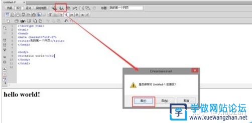 7、点击顶部的小地球图标可以在浏览器中预览,会提示是否保存页面,点击是。