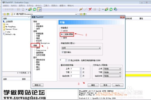 或者在选项-参数选择,配置FlashFXP-传输-传输模式选择二进制模式,点击确定保存这里设置后,所有站点都默认是二进制上传了!