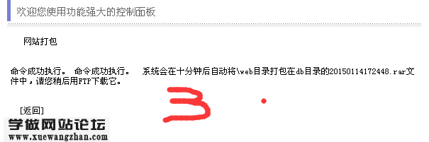 - 点击"马上打包,可能需要几分钟的时间",这样网站空间就会自动将您的网站程序文件打包成RAR文件,自动放置在DB目录。