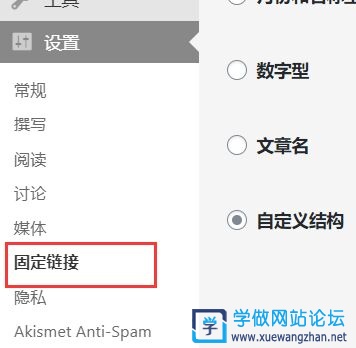 - 点击后台左侧菜单的【设置】-【固定链接】;