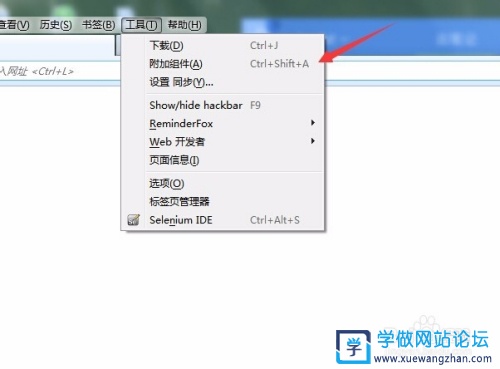 - 火狐的浏览器是没有任意的插件,而在火狐中提供的是firebug的插件,所以需要进行安装,进行打开火狐浏览器,点击菜单中的“工具”》》“附加组件”。