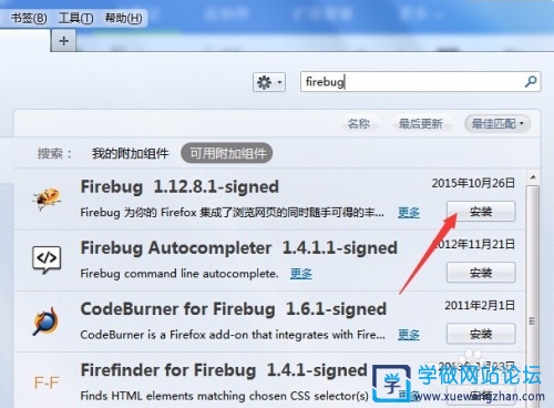 - 搜索结果完成之后,可以在搜索结果找到为firebug,在该的插件中直接进行点击“安装”。