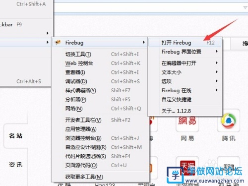 - 进入到下一级的菜单中可以看到为”firebug“,在移动到下一级的菜单中“打开firebug”。