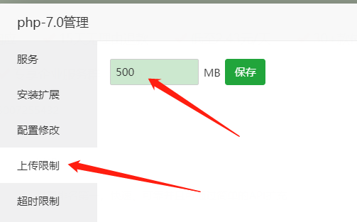 宝塔面板phpmyadmin导入数据库50M的修改方法 宝塔面板phpmyadmin的默认数据库上传大小是限制50M以下,如果想上传最大的数据,就必须修改宝塔面板phpmyadmin导入MYSQL数据库的默认大小了。 修改方法 进入宝塔面板管理 ,点击【软件商店】,在已安装的软件里找到PHP; 点击PHP右侧的【设置】,再点击【上传限制】,修改成需要的大小,保存即可; 上一篇: 免费做网站教程:一步步教你怎么免费建网站 下一篇: 如何用模板做网站,怎么使用模板建一个网站
