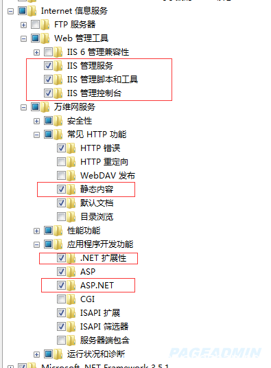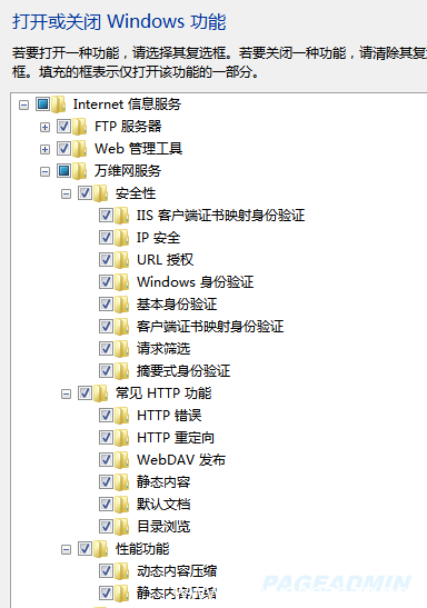 3、打开后出现了安装Windows功能的选项菜单,注意选择的项目,下面这张图片把需要安装的服务都已经选择了,大家可以按照图片勾选功能,然后点击确定按钮安装。