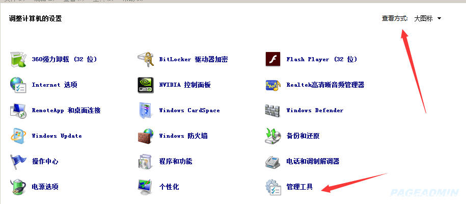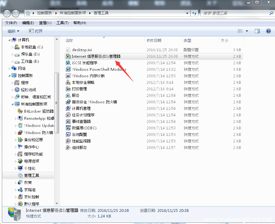 4、安装完成后,再次进入 控制面板,选择 管理工具,双击 Internet(IIS)管理器 选项,进入IIS设置。