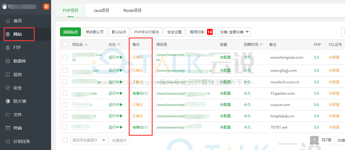 进入宝塔面板,点击左侧“网站”,点击要备份的网站后面的备份列表下面的“无备份”或者“有备份” 进入备份页面,点击 “备份站点”,备份完成后即可下载保存到本地。