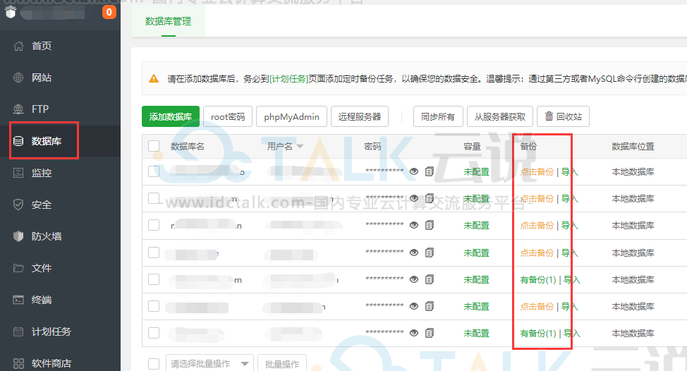 进入宝塔面板,点击左侧“数据库”,点击要备份的数据库后面的备份列表下面的“点击备份”或者“有备份”进入备份页面,点击 “备份数据库”,备份完成后即可下载保存到本地。