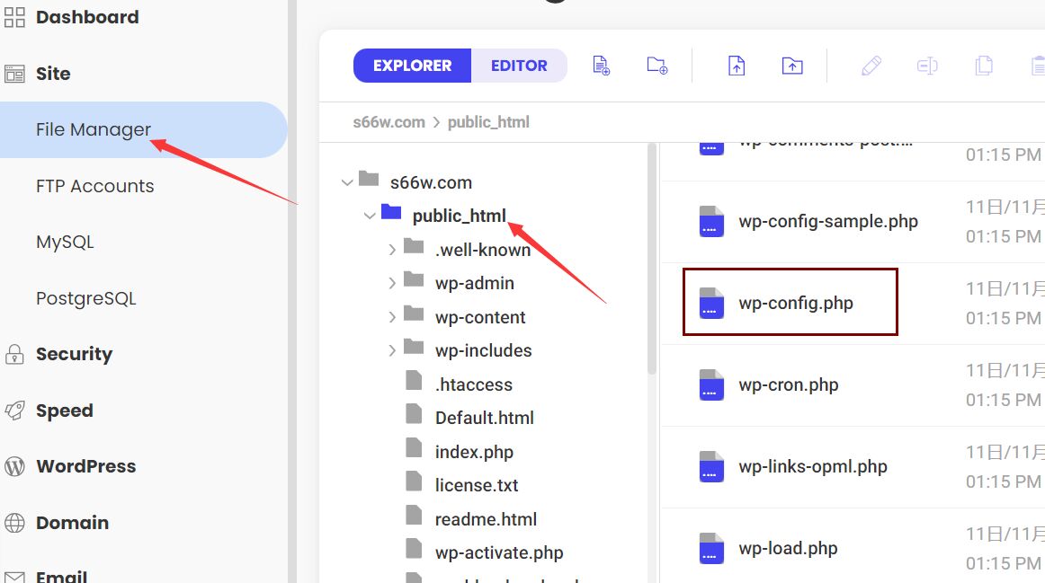在FILE MANAGER选项中,找到wp-config.php,双击它,就可以看到数据库的信息;