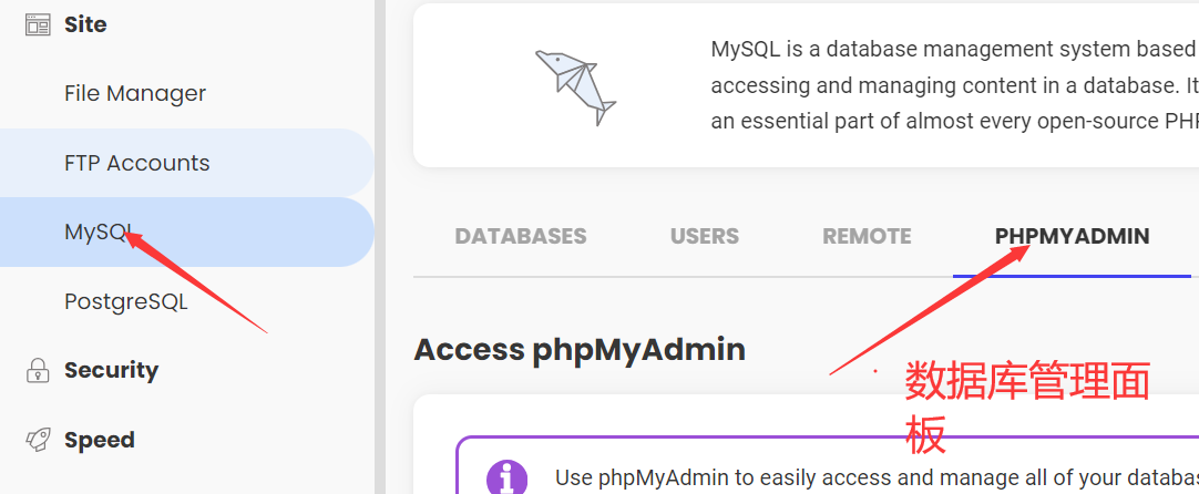在MYSQL选项中,有PHPMYADMIN 面板,可以管理数据库;