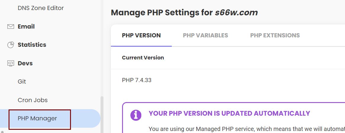 点击左侧的PHP MANAGER选项,可以设置当前站点的PHP版本;最低是PHP7.3;