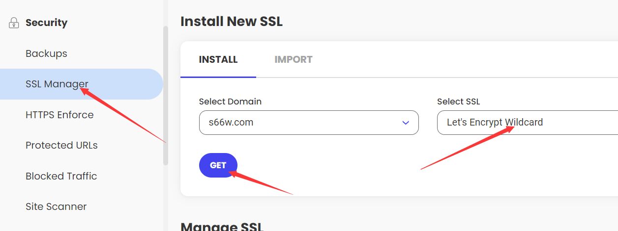 点击SSL MANAGER 选项,可以安装空间自带的SSL证书;