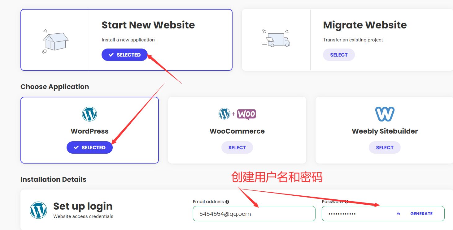 再点 start new website ,并且选择WORDPRESS,它会自动创建数据库和安装WORDPRESS程序,即使你不是wordpress也不要紧,后面可以删除;