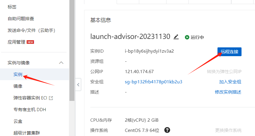 首先登录到云服务器ECS管理控制台,左侧栏【实例与镜像】>>【实例】,找到目标云服务器ECS实例,然后点击右侧的【远程连接】,如下图: