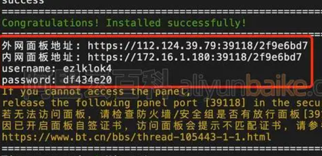 宝塔面板自动安装完成后,会显示宝塔后台登录地址、username和password,如下图: