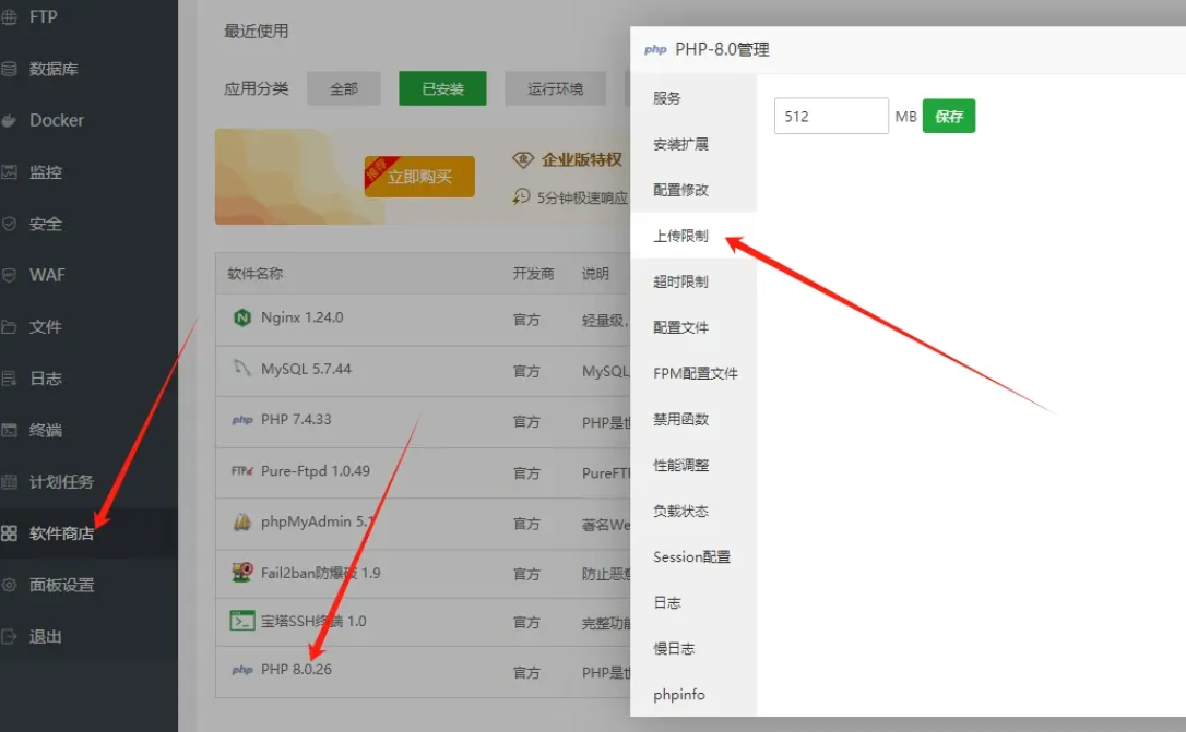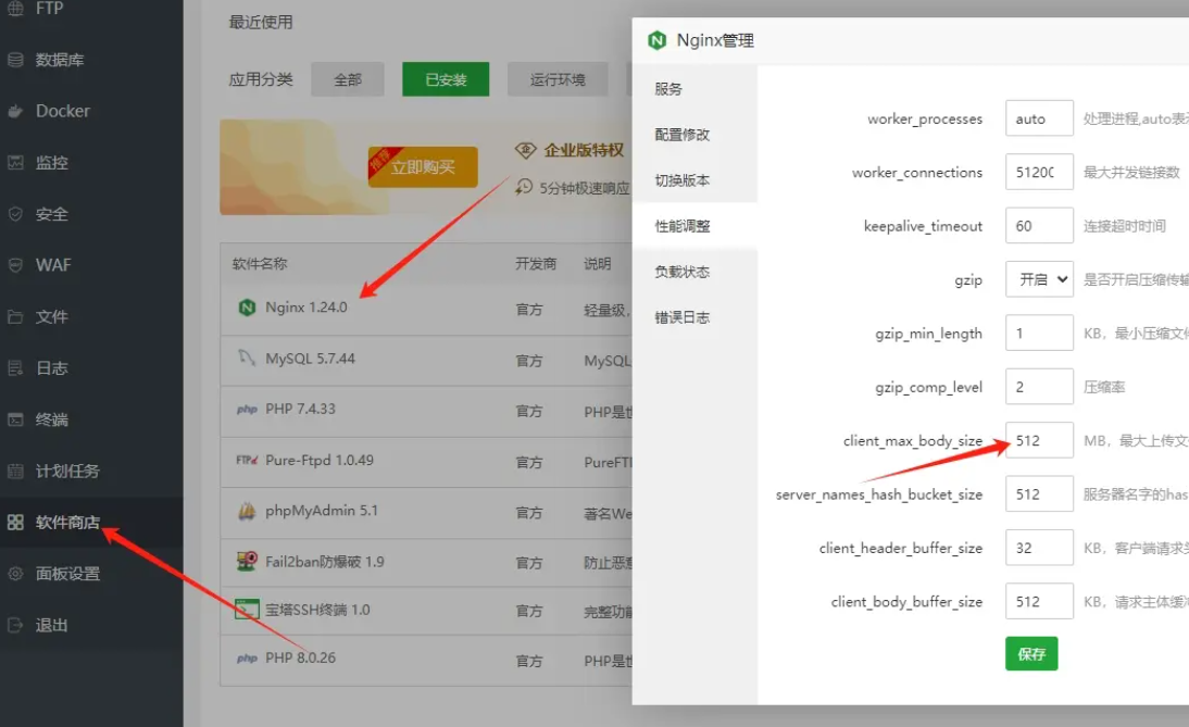 宝塔面板如何修改网站上传限制50M大小 默认情况下,服务器的PHP上传限制为50M,对于多数上传是足够了。如果想在网站后台上传更大的文件,可以在宝塔后台修改上传限制50M的大小。 方法如下: 首先打开Nginx修改一下最大上传文件参数。 然后调整一下PHP的上传文件限制大小。 这样就可以了。 上一篇: 如何制作网站带图的二级下拉菜单 下一篇: 如何使用Input表单制作网站上传文件功能