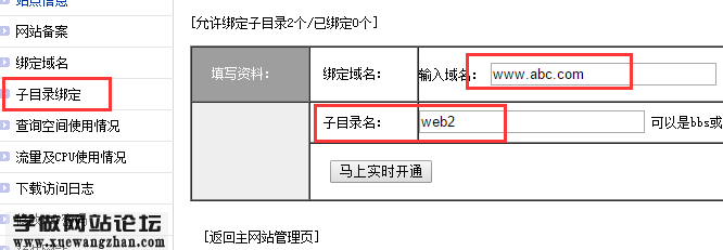 第三步:进入自己空间的管理后台,找到“子目录绑定的”的选项,然后填写自己的域名和刚才重命名的web2,再点击“马上开通”;