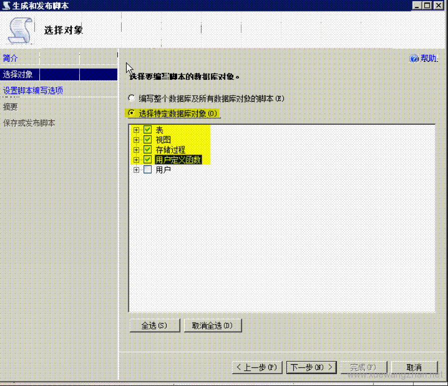 3. 单击 下一步后,选择 选择特定的数据库对象 ,注意不要勾择 用户 。