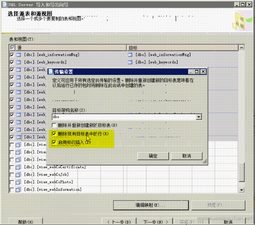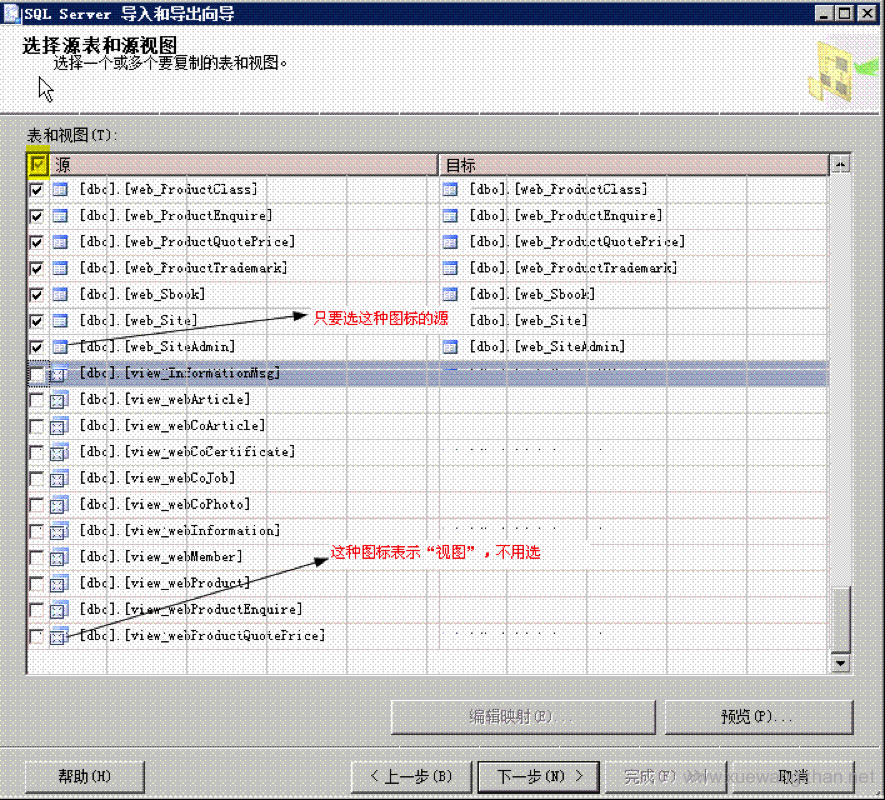 19. 选中要导入的表,注意不要选 视图 (前面相关知识里有提到:视图可以理解为虚拟的数据表,这个表的数据来自物理数据表,所以只要选物理表)。