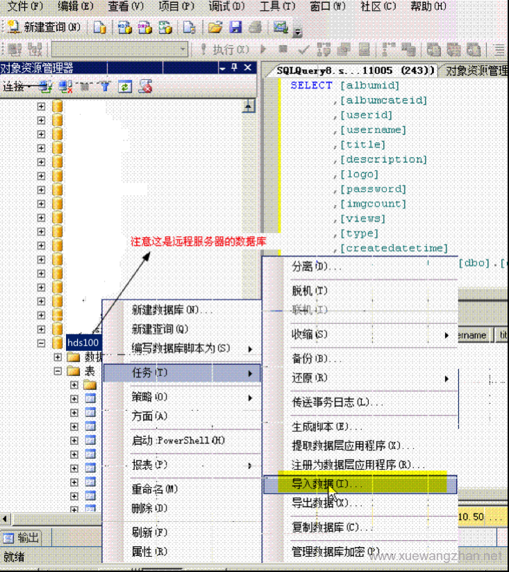 选中远程节点上hds100005678 的数据库,右键 > 任务 > 导入数据 (注意这个是远程节点上的数据库)。