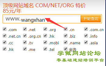 - 在首页的域名框中写上你要注册的网站名称,并且全选所有的域名后缀,然后点击“开始查询”;