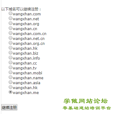 - 可以查询出哪些域名还可以注册,选中某个自己想注册的域名,点击下面的“继续注册”;
