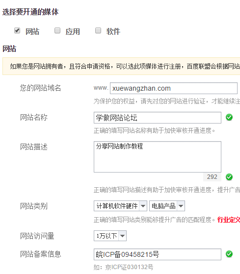 - 网站制作好之后,在百度联盟(https://union.baidu.com/bqt#/)上注册一个帐号,并且填写自己网站的信息,如网站域名,网站名称和网站的简介,当然还少不了网站的备案号。