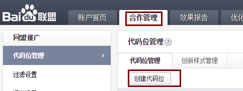 - 下一步就是在自己的网站上投放百度联盟广告了。这里需要使用之前填写的用户名和密码登录百度联盟(https://union.baidu.com/bqt#/),登录后有一个“合作管理”,这里可以设置网站广告位置代码;(相关知识:怎么添加网站广告位)