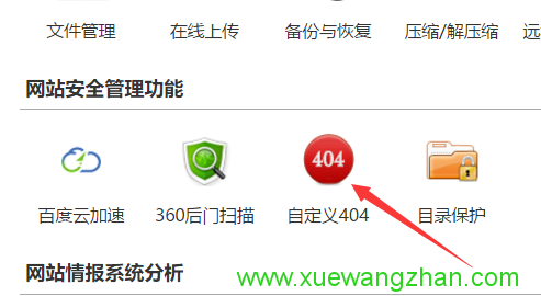 - 点击【虚拟主机管理】-【进入实战管理】,在实战管理里,在【网站安全管理功能】里有一个【自定义404】。如下图: