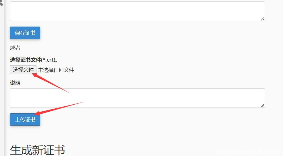 第三步:点击“选择文件”,上传自己购买的第三方的SSL证书里的.CRT文件;