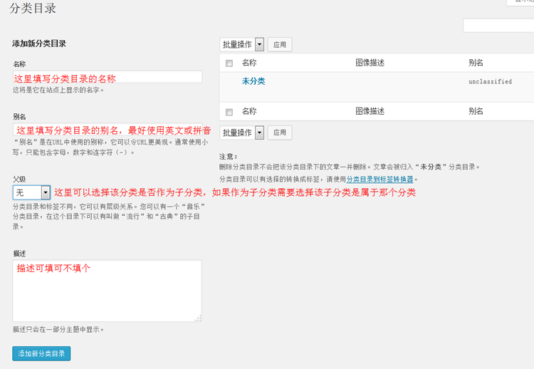 描述要吧填也可以不填,填完后直接点击“添加新分类目录”按钮就可以添加一个新的分类目录了。