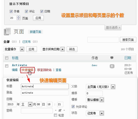 - 将鼠标移至页面标题处,就会显示“编辑、快速编辑、移至回收站、查看”这些功能菜单,如果仅仅要编辑一些页面的属性,直接使用“快速编辑”即可;如果要修改页面的内容,那就要使用“编辑”了。