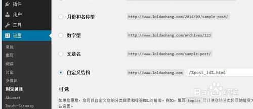 - 登陆到wordpress后台,点击左侧的设置——固定链接