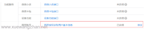 2. 在微信公众平台后台的【开发者中心】-接口权限表,找到【网页授权获取用户基本信息】,点击旁边的开启/修改,如图: