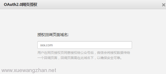 打开后填写授权回调页面域名,写上你的域名,不要加http://,如xuewangzhan.net或者www.xuewangzhan.net 如图: