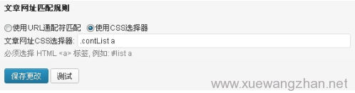 - 文章网址匹配规则。文章网址匹配规则的设置最简单,无需复杂设置,提供两种匹配模式,可以使用URL通配符匹配,也可以使用CSS选择器进行匹配,通常使用URL通配符匹配较为简单,但有时使用CSS选择器更为精确。