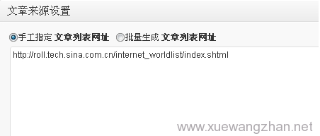 - 文章来源设置。在该选项卡下我们需要设置文章来源的 文章列表网址 及 具体文章的匹配规则。我们以采集”新浪互联网新闻“为例,文章列表网址为http://roll.tech.sina.com.cn/internet_worldlist/index.shtml,因此在 手工指定文章列表网址 中输入该网址即可,如下所示: