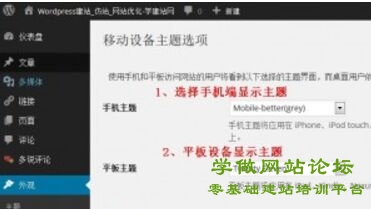 - 上传wordpress手机主题到主题文件夹 或 后台上传安装包(注:wordpress手机主题的开始在学做网站论坛的网站制作课程有详细讲解。)