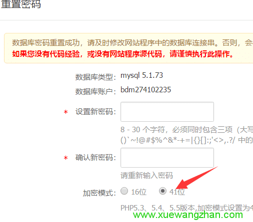 - 修改数据库密码,选择加密方式为41位。如下图: