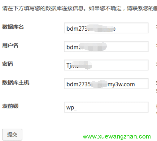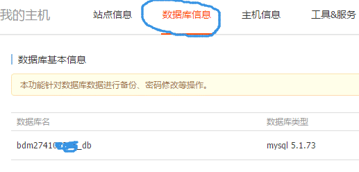 - 上面信息的填写一定要正确,这些信息在 空间管理后台-数据库信息 里可以找到。特别是数据库地址,一定要填写空间商提供的数据库地址,不能使用默认的localhost。如下图: