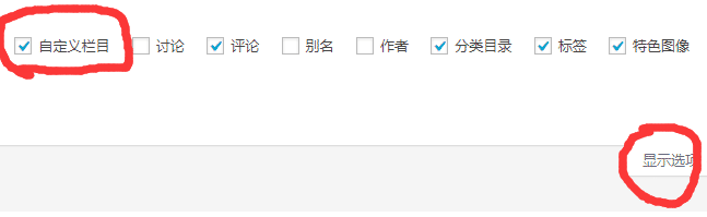 - 首先是开启自定义栏目模块,进入后台后,点击右上角的显示选项,在自定义栏目前打勾就行了;