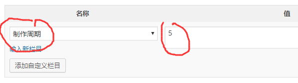 填写自定义栏目中的名称,以及参数的值,比如我想加一个参数为制作周期:5,那么你可以填他的名称为【制作周期】(可以使用英文,也可以使用中文),值为5,保存。如下图: