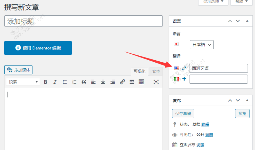 第四步:多语言切换按钮添加好之后,就是在网站后台发布多个语言版本的内容了。可以在后台文章编辑器添加不同语言版本的内容。