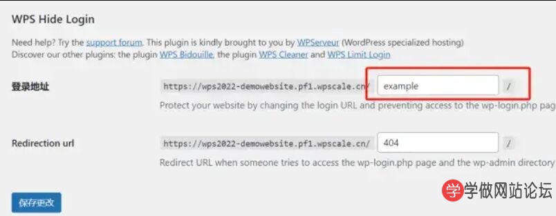 我这里以[ example ]为例,修改完成后,点击【保存更改】,即完成了WPS Hide Login的设置。