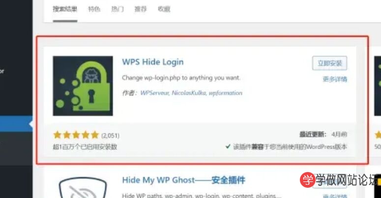 1、通过【仪表盘— 插件— 安装插件】进入插件搜索页面,在搜索框输入【WPS Hide Login】进行搜索,然后点击【立即安装】。安装完成后,点击【启用】插件。