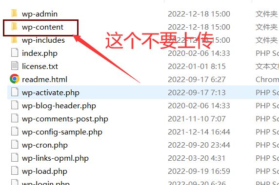 第三步:上传全新的wordpress程序文件到主机根目录,不要上传wp-content文件夹。