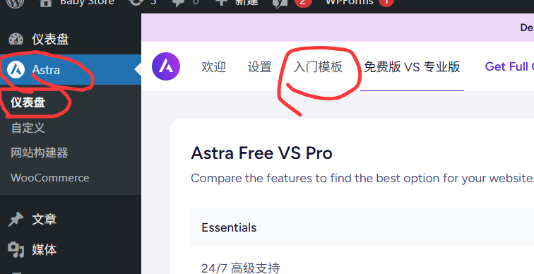 3、启用之后,点击Astra的仪表盘---入门模板----start now(需要安装它的导入插件,用于导入它的子模板)