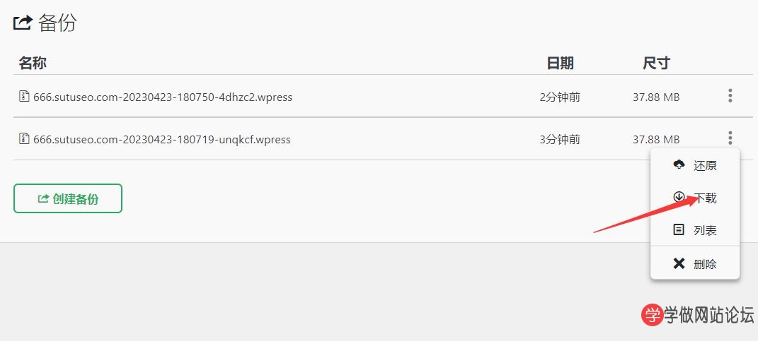第二步:点击后台左侧菜单的【备份】,就会自动备份整站文件和数据了。打包好后,点击下载;就会下载一个.wpress结尾的文件;